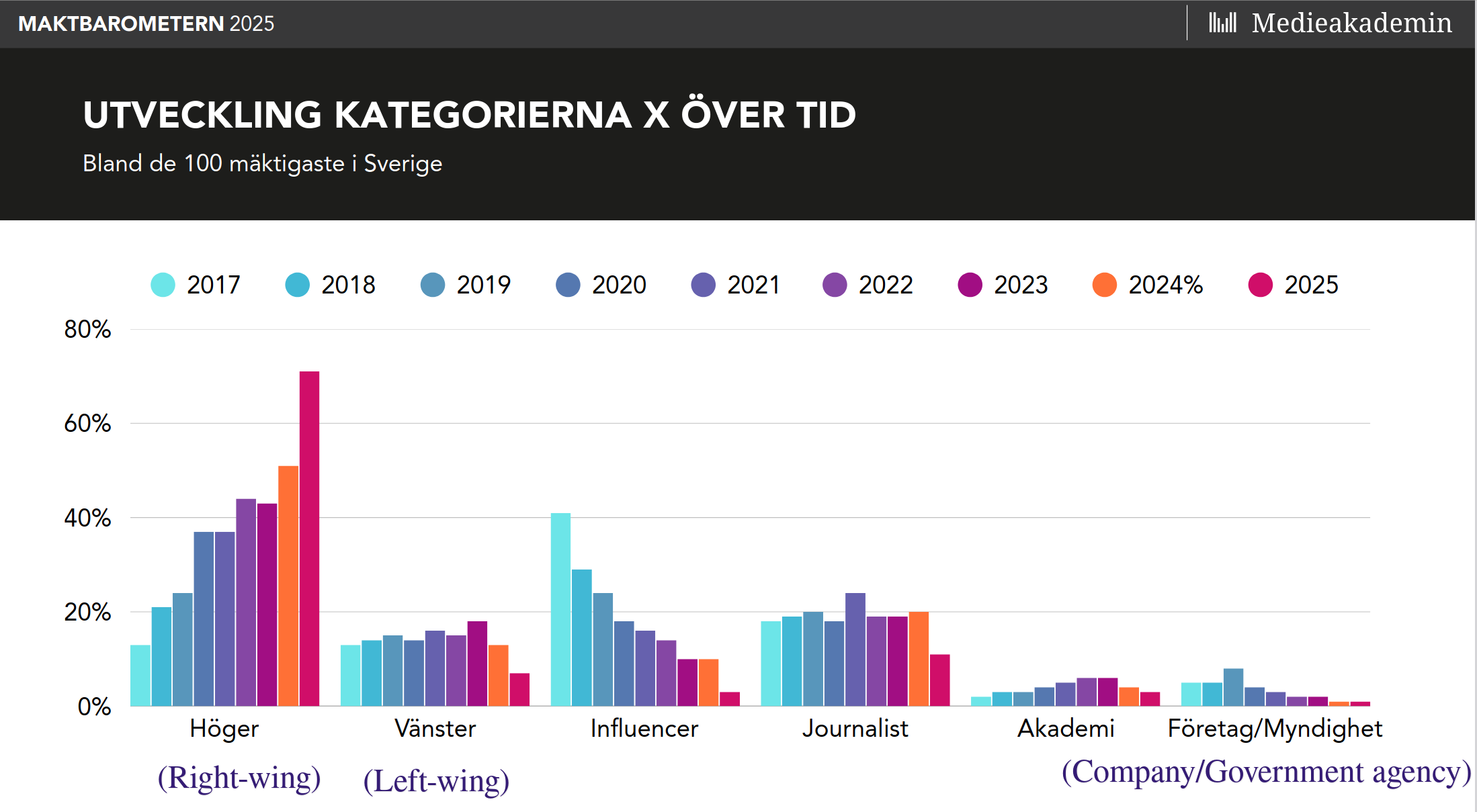 The yearly Maktbarometern (“power barometer”) is here. It's a report about social media reach of various people and organizations in Sweden. Here's a change in different categories of top-100 accounts on Twitter/X: