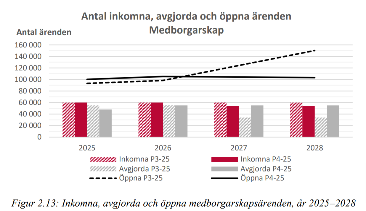 The number of citizenship cases decided is expected to fall this year. This is mainly due to Migrationsverket introducing a new working method on behalf of the government to strengthen the security perspective in these cases. They now think the number of decided citizenship cases in 2025 will be 48000 (a decrease with 7000 cases). Migrationsverket also forecasts that incoming cases about citizenship will decrease in 2027 and 2028 by 6000 cases per year, down to 54000.