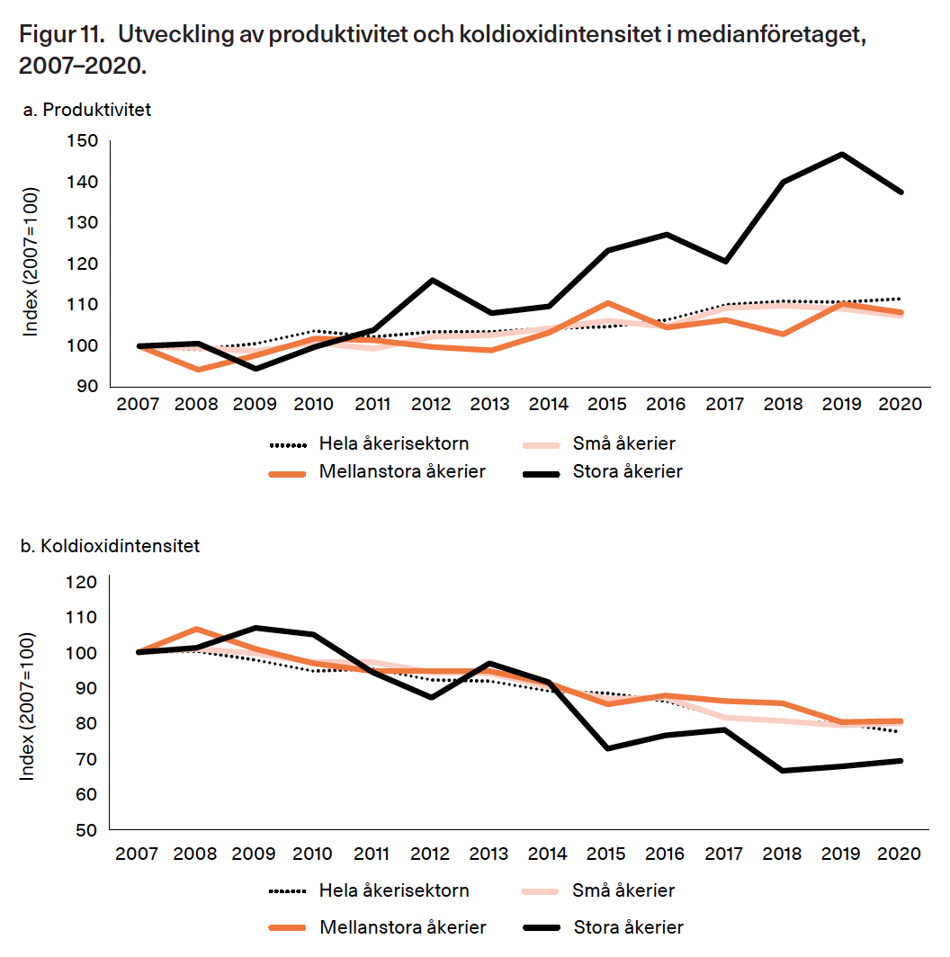 SNS (Center for Business and Policy Studies, an independent, non-profit organization) has published an assessment of the Swedish carbon tax and biofuel blending on the structure, productivity, and carbon dioxide emissions of haulage companies during the period 2007–2020. TL;DR: productivity increased, emissions decreased, especially for the biggest companies (productivity +37%, emissions -30%). The efficiency gains in the industry came mainly from better logistics, route optimization, and heavier vehicles, not from mergers.