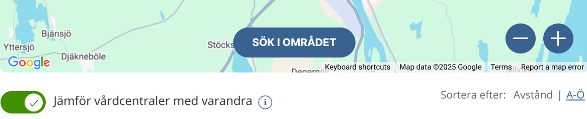You can now compare vårdcentraler directly on 1177.se. Go to Hitta vård, enter where you live in the first field and ‘vårdcentral’ in the second, then turn on the comparison mode by clicking “Jämför vårdcentraler med varandra”.